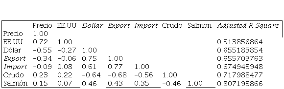 El EDA, al ser el primer análisis, identifica el tipo de correlación más fuerte de 0.77 entre ‘Export’ e ‘Import’ y la más débil existente entre ‘EE.UU’ y ‘Export’ de 0.06. Además, se observa que a medida que cada una de las variables predictoras van adicionándose a la regresión múltiple, el valor del coeficiente de determinación ajustado registra un incremento (ver Figura 2). Este último como una medida más precisa del coeficiente de determinación (R.), compensando la adición de variables solo si el nuevo predictor mejora los resultados del modelo igual a 0.807 y, contrariamente, aminorará su valor frente a lo obtenido a efectos del azar (Investopedia, 2022).
