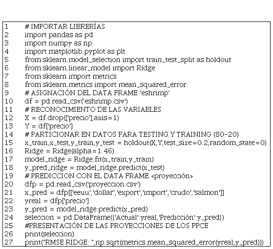 Con toda la información de entrada de rigor para configurar el modelo disponible se asigna ‘Y’ a la variable ventas de camarón y ‘X’ a los PPCE para automatizar las estimaciones. Una vez consensuada la interpolación polinomial se reemplazan los valores de las predicciones de los PPCE para, finalmente, presentar los resultados en pantalla. Tal como se muestra en la codificación de la Figura 6.
