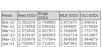 Con un data frame denominado ‘proyección’, correspondiente a los últimos seis registros o primer semestre de 2021, se reemplazarán los valores de los interceptos y coeficientes de las variables explicativas en cada modelo. Se procederá a calcular sus respectivos root mean square error (RMSE) como criterio de medida de precisión para comparar los valores reales PPCE versus los valores predichos o denominados como errores de predicción (Neill & Hashemi, 2018, p. 216). Este método está acorde a la robustez de los modelos.