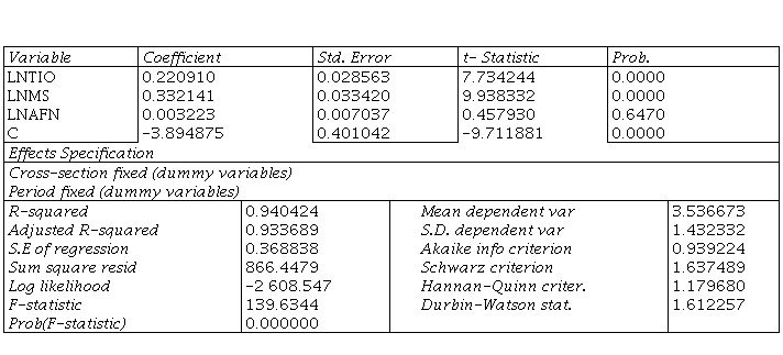 En el modelo la variable dependiente, LNCE, estableció el Logaritmo Natural de la Cantidad de Empleados en cada una de las empresas manufactureras e incluyó al personal administrativo y obrero. La variable independiente LNAFN estuvo dada por el Logaritmo Natural de los Activos Fijos Netos, presentados en los balances generales de las empresas. La variable LNTIO constituyó el Logaritmo Natural del Total de Ingresos Operacionales percibidos por cada empresa y el LNMS estuvo establecido por el Logaritmo Natural de la Masa Salarial del personal ocupado, siendo este el total de remuneraciones más las contribuciones sociales existentes.