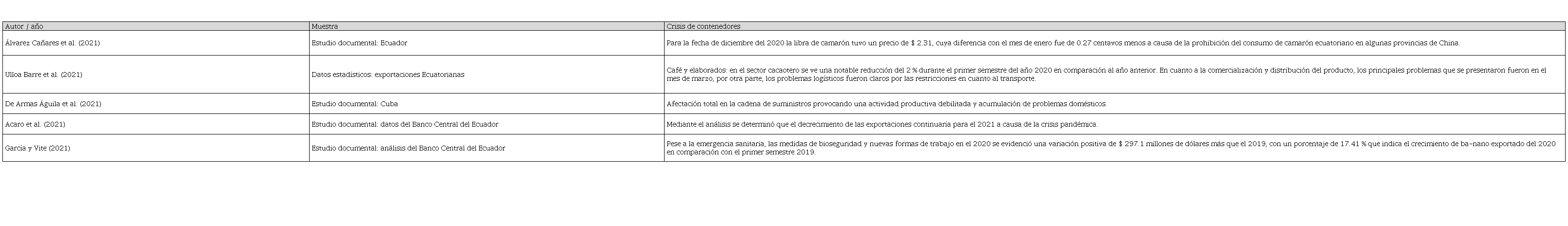 En base a lo planteado se establecen cinco estudios de casos de exportaciones que se han visto afectadas por la crisis de contenedores. Los resultados están sistematizados en la Tabla 1, misma que dispone el autor y año, muestra, crisis de contenedores y explica el efecto que ha tenido en las exportaciones de banano y otros.