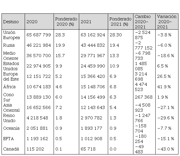 En el 2021 solo el sector bananero tuvo una recesión en sus ventas de hasta un 5.5 % en toneladas y un 9.1 % en dólares. En comparación al 2020, casi al finalizar el segundo semestre del año los puertos registraron una salida de 5 253 toneladas de fruta, traducida en ingresos representan $ 2 598 millones de dólares a nuestra economía, generando 500 000 empleos (España, 2021)
