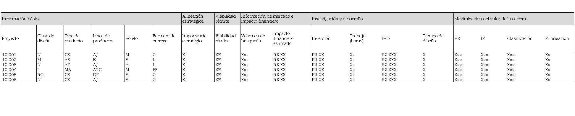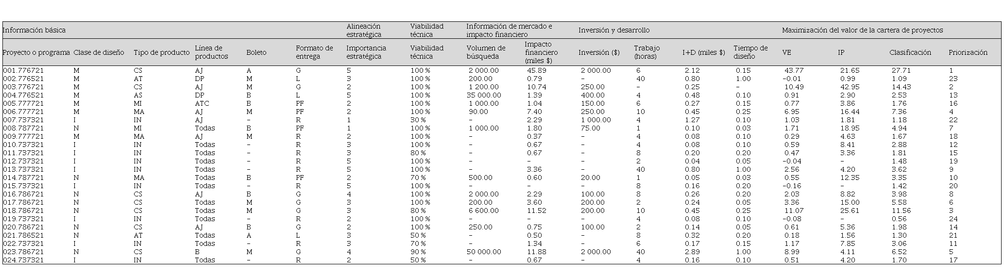 La Tabla 2 presenta el modelo contemplando la información básica del proyecto, alineación estratégica, factibilidad técnica, información comercial y de mercado, información financiera y de desarrollo, a la par, maximiza el valor de la cartera. Esta tabla servirá para organizar la clasificación y servirá como base de datos para crear información gráfica del portafolio.