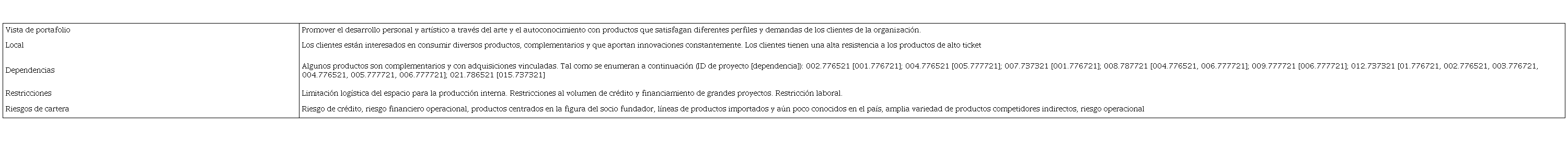 La visión de la cartera mostrada fue definida por los socios de la empresa en base al posicionamiento, objetivos y metas estratégicas de la organización. Las premisas se construyeron de acuerdo con criterios cualitativos recogidos empíricamente por la experiencia profesional de uno de los socios, así como por declaraciones de clientes directos y potenciales en los canales de comunicación de la organización. En la evaluación de dependencias se identificaron siete proyectos directamente relacionados con otros proyectos o programas. De los siete proyectos, cuatro corresponden a iniciativas ya activas en cartera y tres a componentes aprobados, pero aún no iniciados.