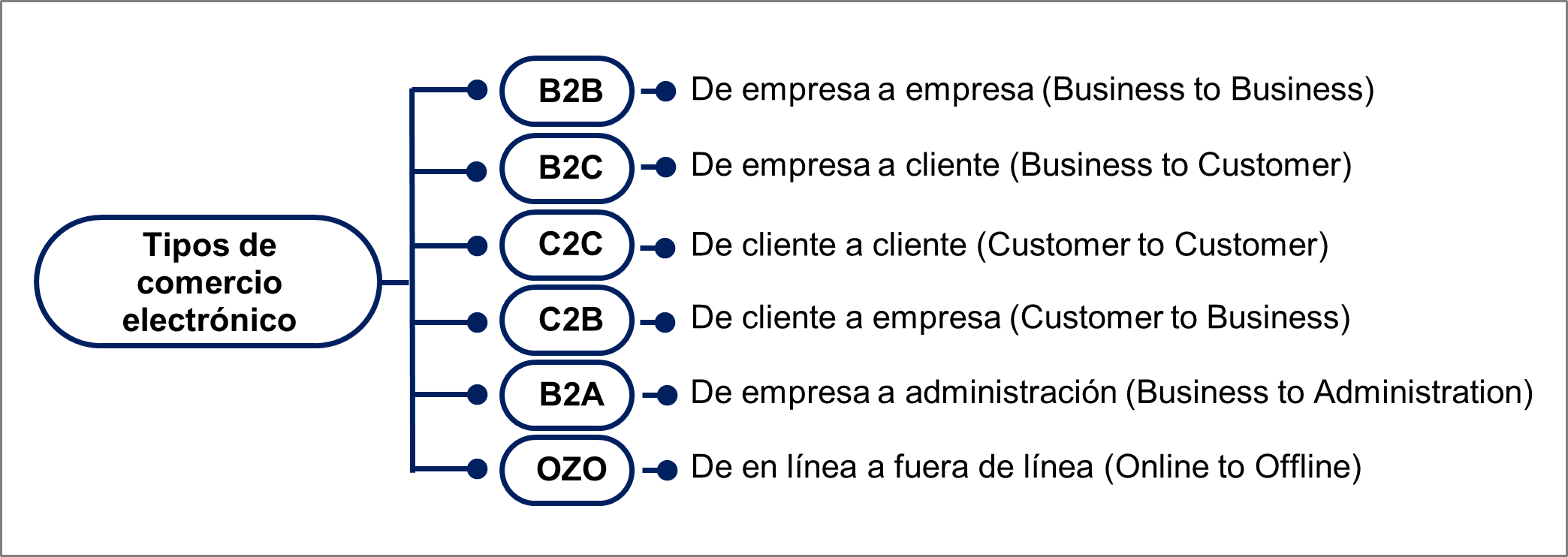 Precisamente, este esquema responde a los tipos de comercio electrónico (Figura 1), cuya idea general recae en las operaciones de compra-venta y pagos electrónicos utilizando TICS (tecnologías de la información y comunicación) sin obligación de entrar en contacto físico con los vendedores (Almarabeh & Majdalawi, 2019). Además, garantiza a las empresas la eliminación de barreras en el mercado, puesto que se obtienen más clientes potenciales a menores costos y se reducen las tasas de devolución por parte de los consumidores.
