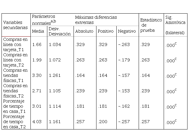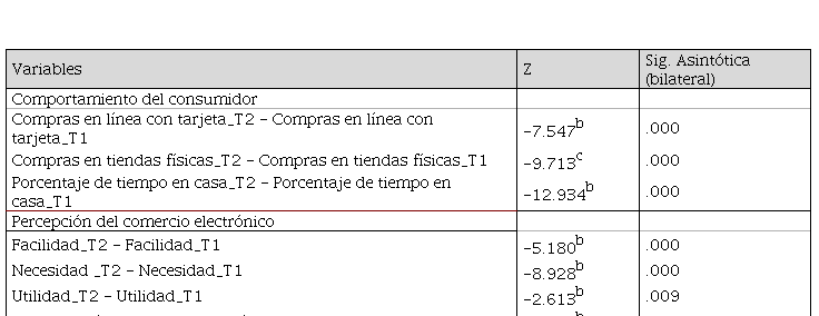 Una vez demostrado que la información levantada fue de naturaleza no paramétrica —y cuya muestra evidenció un fuerte grado de fiabilidad— se procedió a realizar el análisis de los datos mediante la prueba de rangos con signo de Wilcoxon para dos grupos relacionados en SPSS. Se tomaron en consideración los ítems de compras en línea con tarjeta para T1 y T2, compras en tiendas físicas para T1 y T2, y el porcentaje de tiempo en casa para T1 y T2 (Tabla 3).