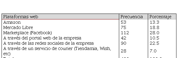 En el caso de los sitios web utilizados (ver Tabla 5) para el comercio electrónico se evidenció un decrecimiento en la preferencia de compras través de las plataformas de Mercado Libre y Market Place, en contraposición del incremento en las preferencias sobre las redes sociales de la empresa para hacer uso de una compra más efectiva.