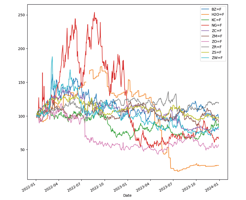 En un análisis inicial de los activos del portafolio del nexo AEA, se observan valores significativos en diversas commodities antes de la normalización de los datos. Por ejemplo, el activo H2O=F (agua) muestra un valor alto de USD 732.00, reflejando posiblemente su creciente importancia en el mercado pospandemia. Por otro lado, BZ=F (petróleo Brent) se sitúa en USD 78.98, lo que podría indicar fluctuaciones relacionadas con los mercados energéticos globales. Entre los productos agrícolas, ZC=F (maíz) y ZW=F (trigo) muestran valores de USD 589.25 y USD 758,00 respectivamente, destacando la relevancia de los bienes agrícolas en este portafolio. Por otro lado, el valor de NG=F (gas natural) es relativamente más bajo, en USD 3.815, sugiriendo una dinámica de mercado diferente o una menor ponderación en el portafolio.