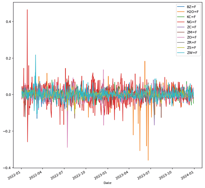 Al calcular la tasa de retorno promedio anual de los activos que componen el portafolio del nexo AEA, se observa un panorama diversificado en términos de rendimiento. La tasa de retorno anual para BZ=F (petróleo Brent) es del 6.73 %, lo que puede reflejar una recuperación robusta en el sector energético pospandemia. En contraste, H2O=F (agua) muestra una disminución significativa, con una tasa de retorno promedio de -53.22 % anual, lo que señala una potencial sobrevaloración previa o un reajuste del mercado a una nueva valoración. Por otro lado, NG=F (gas natural) muestra un incremento de 15.62 % anual, posiblemente debido a su creciente demanda en la transición energética. Los activos agrícolas como ZC=F (maíz) y ZW=F (trigo) presentan tasas de retorno anuales ligeramente negativas y positivas respectivamente, lo que podría sugerir una menor volatilidad en estos mercados. En la Figura 2 se presenta el retorno diario de cada uno de los commodities del porfolio.