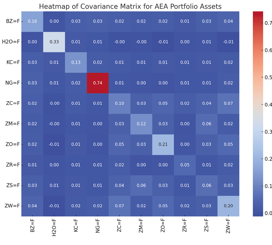 La matriz de covarianza (Figura 3) de los activos del portafolio del nexo AEA revela patrones de volatilidad y correlación que son fundamentales para entender la dinámica de riesgo interno. Específicamente, el gas natural (NG=F) exhibe la covarianza individual más alta, lo que indica una volatilidad considerable y, por ende, un riesgo potencialmente mayor asociado a este activo. Además, la correlación relativamente alta entre el gas natural y el petróleo Brent (BZ=F) sugiere que estos energéticos comparten factores de mercado que afectan simultáneamente sus precios, posiblemente vinculados a cambios en las políticas energéticas o fluctuaciones en la demanda global. Por otro lado, el agua (H2O=F) muestra una variabilidad pronunciada con respecto a sí misma, pero tiene pocas correlaciones fuertes con otros activos, lo que podría interpretarse como un comportamiento más aislado de factores específicos del mercado de agua. Curiosamente, los activos agrícolas (ZC=F, ZM=F, ZO=F, ZR=F, ZS=F, y ZW=F) presentan una serie de covarianzas moderadas entre sí, lo que refleja una posible conexión en sus movimientos de precios debido a factores comunes como las condiciones climáticas, políticas comerciales, y tendencias de consumo. Este entendimiento de las interdependencias y la diversificación de riesgos es crucial para optimizar la asignación de activos en la gestión de portafolios pospandemia.