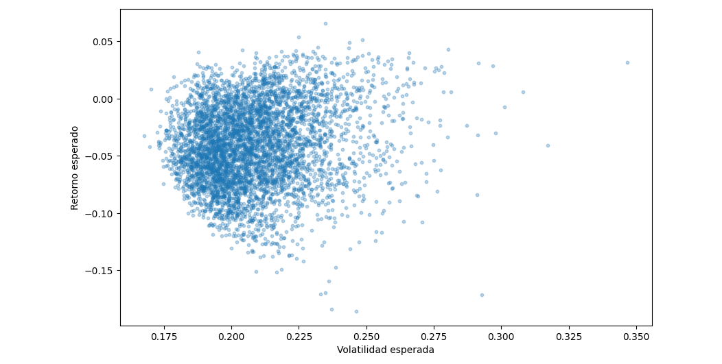 La Figura 4 exhibe la nube de puntos que representan diferentes portafolios en el espacio de retorno esperado versus volatilidad esperada. La forma de la distribución sugiere una correlación positiva típica entre el retorno y la volatilidad esperados; a medida que aumenta la volatilidad, también lo hace el retorno potencial. La configuración del portafolio de volatilidad mínima, tal como se evidencia en la asignación dada de los activos H2O=F 4 %, BZ=F 8 %, NG=F 17 %, ZW=F 3 %, ZC=F 6 %, ZS=F 5 %, ZM=F 11 %, ZO=F 23 %, ZR=F 22 % y KC=F 0 %, demuestra una táctica de inversión diseñada para reducir el riesgo global a través de la diversificación estratégica. Aunque el retorno esperado es negativo, situado en -3.22 %, este resultado podría ser una consecuencia aceptable dentro de la estrategia de minimización de riesgos, especialmente en un clima de mercado pospandémico potencialmente volátil. La volatilidad de este portafolio se sitúa en 16.75 %, reflejando una menor variabilidad en los retornos comparada con opciones más riesgosas.