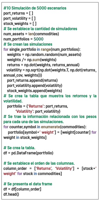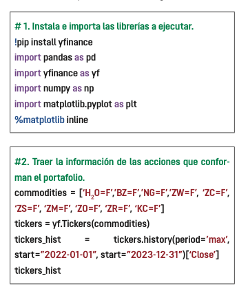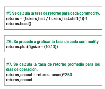 Para el cumplimiento del objetivo se desarrolló un algoritmo haciendo uso en el lenguaje de programación de Python que permita: la importación de la información bursátil de los tickers objeto de estudio, la normalización de los datos, la evaluación del retorno de los commodities, la evaluación del riesgo del portafolio y el cálculo de la Frontera de Eficiencia de Markowitz. A continuación, se presenta la descripción de los pasos.