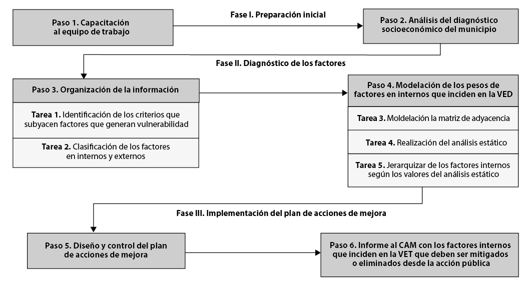 La estructura del procedimiento parte de la preparación inicial que sustenta la identificación, organización y homogenización de la información que sirve como base para desarrollar las etapas posteriores que aseguran la identificación, clasificación y jerarquización de los factores que exacerban la vulnerabilidad económica y permiten diseñar acciones para mitigar o eliminar los factores internos seleccionados.