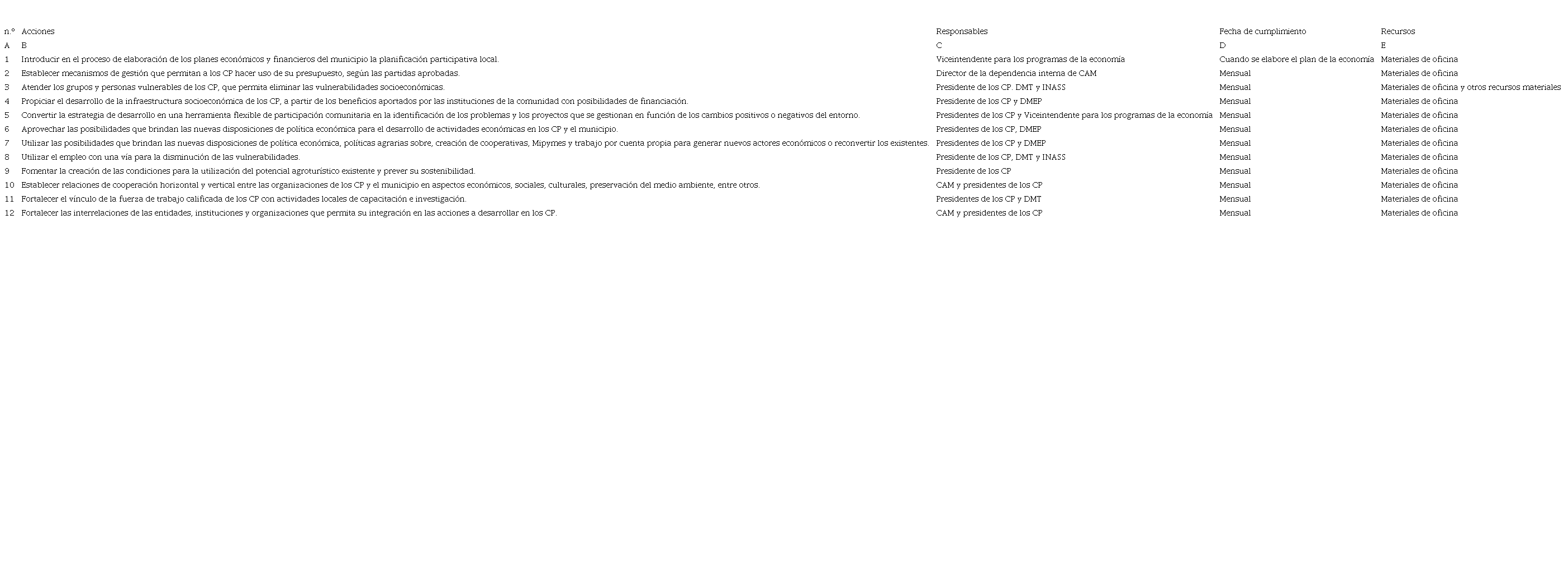 En el resumen de las 12 acciones de mejora previstas, en siete (7) su grado de cumplimiento es alto y en cinco (5) su grado de cumplimiento es medio. Con base en este resultado, se procede por parte de los encardados de gestar las políticas públicas a su análisis para la inclusión en la EDT. Las acciones propuestas permitirán: a) potenciar de forma coherente la distribución de los recursos a los CP; b) adecuada gestión de proyectos de desarrollo local que tributen a la satisfacción de las necesidades de la población, c) adecuado diagnóstico y utilización de las potencialidades económicas presentes en los CP. Como resultado del efecto de la aplicación de las acciones se contribuye a incrementar el acceso al trabajo remunerado, perfeccionar las articulaciones verticales entre los CP con el municipio y horizontales entre estos últimos, y fomentar la gestión del desarrollo, lo que implicó el aprovechamiento de las capacidades de las comunidades para lograr su sostenibilidad por medio de la autogestión.