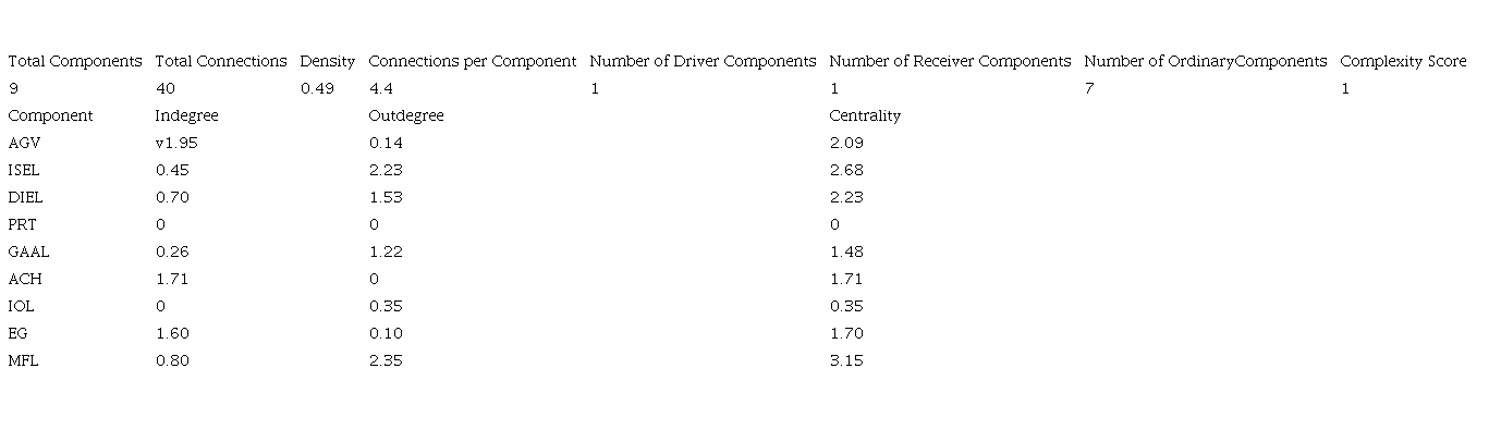 En la Tabla 5 se muestran los valores estáticos generados como salida del modelo, donde se puede observar que los factores: ACH y EG forman una relación de entrada, la IOL de salida; los factores (AGV, ISEL, DIEL, AAL, MFL) relaciones ordinales, es decir, de entradas y salidas, finalmente el factor PRT muestra una relación de nulidad. La densidad (d) entre los diferentes factores es d > 1, lo que confirma la validez de las estimaciones dadas por los especialistas, que se expresan como la salida del modelo aplicado. Esto se evidencia al obtener 40 relaciones de 81 posibles entre los diversos factores, con una razón promedio de 4.4, indicando un bajo nivel de interacción, indicando la diferencia existente entre la incidencia provocada entre los factores.