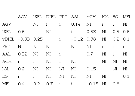 Luego se procedió a completar y asignar los valores de indeterminación en la MAN. Para ello se modifican los valores de salida que da el modelo, donde se sustituyen los nodos que no guardan relación entre sí por (i). Además, las celdas vacías sin valores asignados se completan con (NI) porque no afectan la comparación, como se muestra en la Tabla 6.