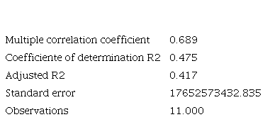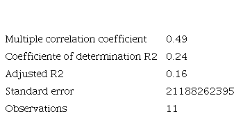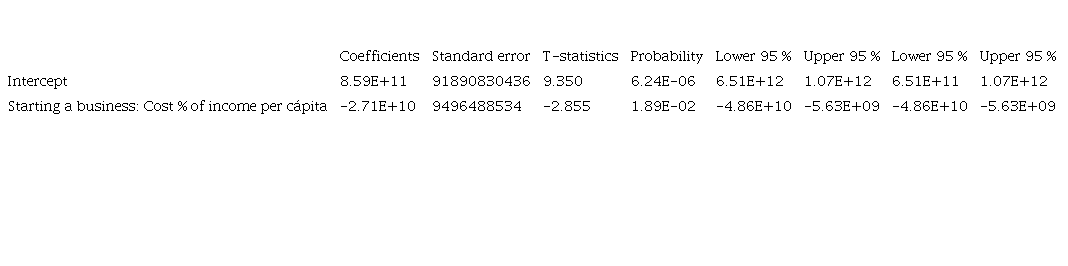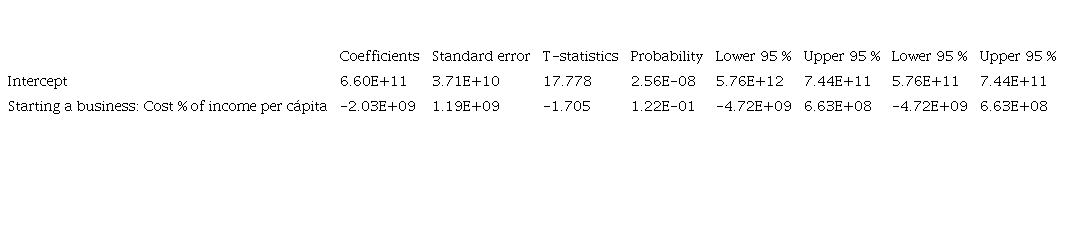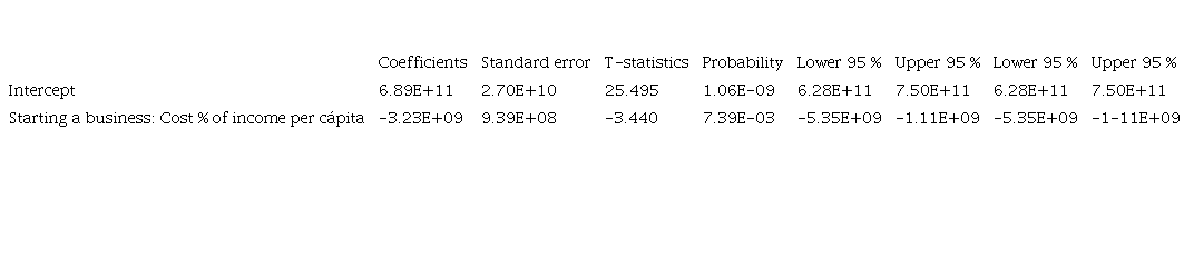 According to the information presented in Table 8, it is observed that the multiple correlation coefficient is 0.49, which in other words explains that the variable number of days required to open a company depends on 49 % of the economic growth represented by PPP GDP. For the following variable, a p-value of 0.00739 and an R2 of 0.568 are presented for the cost variable as a percentage of the per capita income of opening a company, which corroborates an acceptance of the relevance of the correlation effect with respect to economic growth, reaffirming the initial hypothesis.