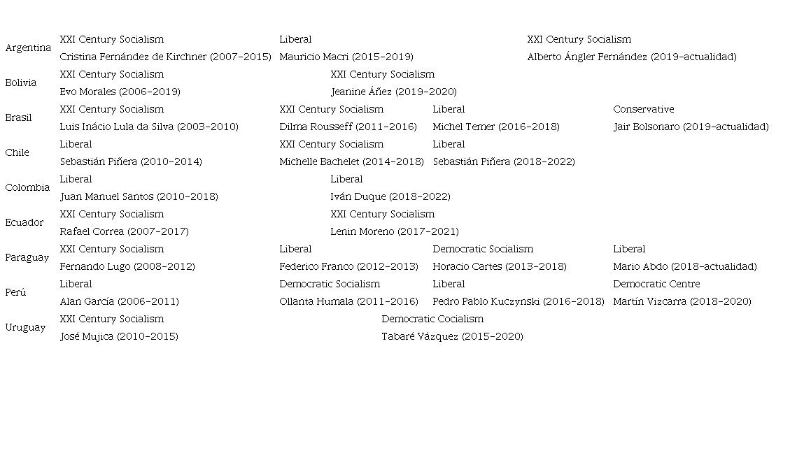 Table 9 presents the transitions between the governments belonging to 21st Century Socialism, liberal governments, and other trends. In the same Table, the governments of 21st Century Socialism is those that spent the longest time in power, the most outstanding cases being those of Venezuela, Ecuador, Bolivia, Brazil, and Argentina. All these governments implemented have very similar recipes such as the creation of a new constitution, extraordinary powers for the executive, complete submission of the armed forces to the executive, persecution of journalists, businessmen and adverse politicians, and negligence in the oversight of corruption cases.