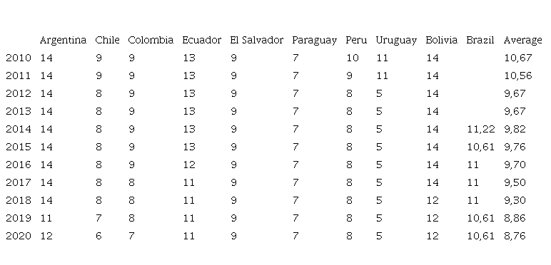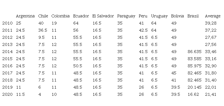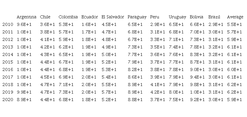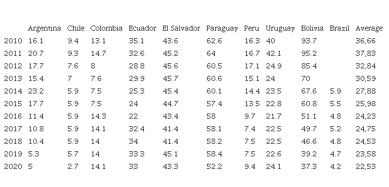These data have been obtained from World Bank Data, with 10 Latin American countries, which are: Argentina, Chile, Colombia, Ecuador, El Salvador, Paraguay, Peru, Uruguay, Bolivia, and Brazil, during the years 2010-2020.