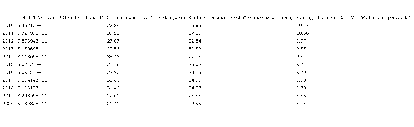 The results indicate that the p-value for the variable ‘Starting a business: Cost (% of income per capita)’ is 0.00739. This provides sufficient evidence to reject the null hypothesis and conclude that the regression is statistically significant. In this sense, the coefficients reveal that the intercept b0) is equal to 6.89, which shows the GDP PPP when the number of procedures of the variable ‘Starting a business’ is equal to zero. While the increase in the independent coefficient (b1) is equal to -3.23, which exposes the marginal effect of one unit of costs of opening a company on GDP PPP. Therefore, the analyses of the independent variables by country are presented below.