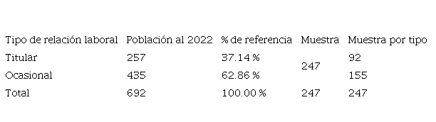 La población objetivo (es decir, el universo hipotético) representa el conjunto completo de individuos o elementos a los que se desea aplicar los resultados o conclusiones de una investigación. Es el grupo amplio al que se pretende generalizar los hallazgos del estudio. Por otro lado, la población marco (a veces denominada universo finito) se refiere al conjunto específico y bien definido de unidades o elementos del cual se selecciona la muestra en el proceso de investigación. Esta población marco es el grupo del cual se extraen los datos para realizar el análisis y obtener conclusiones válidas (López y Fachelli, 2015). Este estudio considera como población objeto a los catedráticos contratados y titulares de la Universidad Nacional de Loja, institución que para el año 2022 dispuso de 692 profesores (344 hombres y 348 mujeres). Es preciso especificar que el 37.2 % (257 profesores) tienen la condición de titulares y el 67.3 % (435 profesores) cuentan con un contrato ocasional (Universidad Nacional de Loja, 2023). Seguidamente, se presenta la población por género.