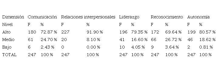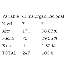 Para la variable clima organizacional se presenta que el 68.83 % de todos los indicadores obtiene un nivel alto, el 29.55 % alcanza un nivel bajo y solamente el 1.62 % logra un nivel bajo.