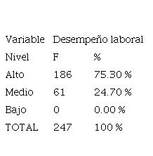 Para la variable desempeño laboral se presenta que el 75.30 % de todos los indicadores obtiene un nivel alto y el 24.70 % alcanza un nivel medio.