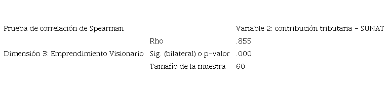 Luego de haber procesado en el software SPSS 27 los datos recabados para contrastar la hipótesis específica 3: emprendimiento visionarios se tuvo una Rho de correlación de Spearman positiva alto de 0.855 y un p-valor de 0.000, por lo que se estableció el rechazo de la misma. En otras palabras, existe una relación significativa directa entre emprendimiento visionario en la contribución tributaria a la SUNAT en la provincia de Coronel Portillo, 2022.