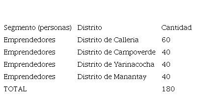 La muestra del estudio se estableció utilizando la técnica de muestreo probabilístico aleatorio simple, con una distribución proporcional a un total de 180 emprendedores ubicados en los diferentes distritos de la provincia de Coronel Portillo (Campoverde, Calleria, Yarinacocha, Manantay).