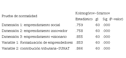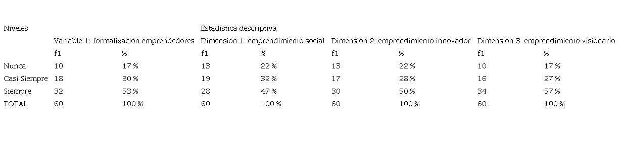 En la Tabla 3 se aprecian los resultados obtenidos en el cuestionario aplicado a los emprendedores, diseñado para medir la variable 1: formalización de emprendedores. El cuestionario fue diseñado para evaluar el nivel de acuerdo de los encuestados en relación con tres dimensiones principales: emprendimiento social, emprendimiento innovador y emprendimiento visionario. Estas dimensiones permiten analizar la percepción y disposición de los emprendedores hacia la formalización. Los resultados obtenidos proporcionan información relevante sobre los factores que influyen en la adopción de procesos formales por parte de los emprendedores de la provincia.