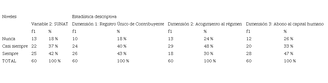 Los resultados de la encuesta relacionada con la variable 2: contribución tributaria SUNAT se centran en evaluar la percepción de los emprendedores sobre la importancia y efectividad del sistema tributario en su formalización. Para este análisis se han considerado tres dimensiones fundamentales: el Registro Único del Contribuyente, el acogimiento al régimen y el abono al capital humano. Cada una de estas dimensiones ofrece una perspectiva única sobre cómo los emprendedores ven el sistema tributario y su relación con la formalización de sus negocios.
