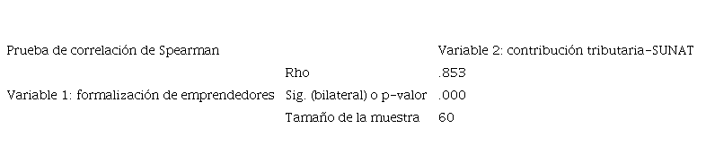 Después de realizar el procesamiento de los datos recopilados mediante el software SPSS versión 27 para verificar la hipótesis general de este estudio, se obtuvo un valor de Rho de Spearman de 0.853. El resultado indica una tensión positiva alta. Además, se registró un p-valor de 0.000, lo que llevó a rechazar la hipótesis nula. Esto sugiere que existe una relación significativa y directa entre la formalización de los emprendedores y su contribución tributaria a la SUNAT en la provincia de Coronel Portillo durante el año 2022.