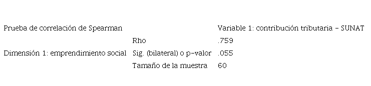 Tabla 7. Prueba de hipótesis especifica 1: emprendimiento social vs. contribución tributaria-SUNAT