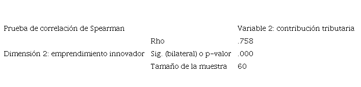 Después de procesar los datos recopilados utilizando el software SPSS 27 para evaluar la hipótesis específica relacionada con el emprendimiento innovador se obtuvo un valor de Rho de Spearman de 0.758. El resultado indica una compensación positiva alta. El p-valor correspondiente fue de 0.000, lo que llevó al rechazo de la hipótesis nula. Esto sugiere que existe una relación significativa y directa entre el emprendimiento innovador y la contribución tributaria a la SUNAT en la provincia de Coronel Portillo durante el año 2022.