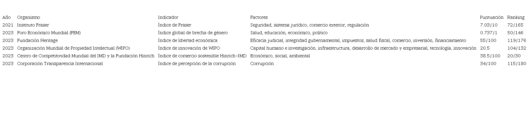 Nota: elaboración propia a partir de Vásquez et al. (2021); World Economic Forum (2023); Heritage Foundation (2023); Worl Intellectual Property Organization (WIPO) (2023); Hinrich Foundation & World Competitiveness (2023); Transparency International (2023).