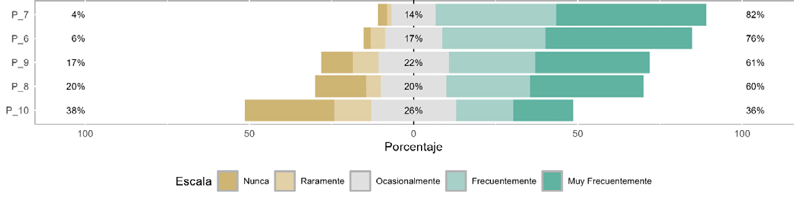 Como se muestra en la figura 7, se realizó la relación desde la P_6 hasta la P_10, para identificar cuál es el tipo de transacción que los usuarios realizan con mayor y menor frecuencia y dentro de ello se obtuvo, que las transferencias bancarias y la consulta de saldos son las actividades realizadas por los usuarios con mayor frecuencia, seguido del pago de servicios básicos y de las tarjetas de créditoEn último lugar están las inversiones, como el tipo de transacción que menos ejecutan los usuarios en la banca en línea.