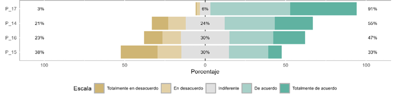 ¿Considera que es fácil el manejo de la plataforma digital de la institución financiera que más frecuenta? (P_11). ¿Se siente usted satisfecho con los servicios que oferta la plataforma digital de su institución financiera? (P_12). ¿Considera que su banco de preferencia es confiable en cuanto a temas de seguridad al momento de realizar cualquier tipo de transacción? (P_13). ¿Considera que su banco de preferencia es confiable en cuanto a temas de seguridad al momento de realizar cualquier tipo de transacción? (P_17). En estos casos, se busca referentes a las dimensiones de aceptación de los usuarios y seguridad, dejando como dato atrayente que las dimensiones de fiabilidad y proyección no son tan representativas en la experiencia del cliente.