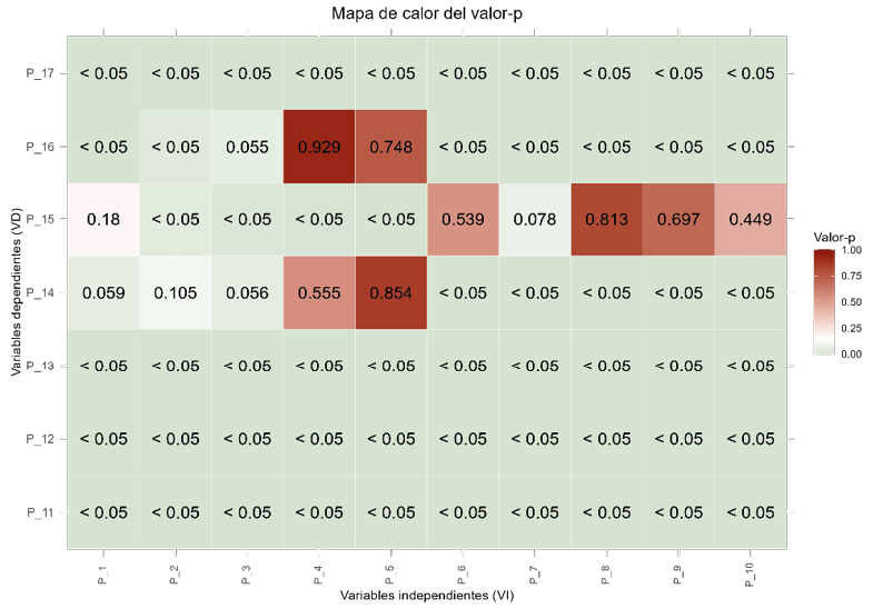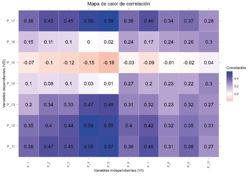 Para el análisis de los datos se realizó la correlación de las variables bajo el coeficiente de spearman. En la figura 1 se puede visualizar que: las correlaciones más fuertes se observan entre las variables P_11, P_12, P_13 y P_17 con las variables independientes P_4 y P_5. Además, P_15 muestra un patrón distinto al resto, con correlaciones negativas; la mayoría de las correlaciones son positivas pero de débiles a moderadas; además, no hay correlaciones muy fuertes (>0.80) en ningún caso.