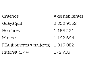 A través de la tabla 1 se especificaron las variables con respecto a la definición de la población, mediante la información obtenida por el INEC 2010. Para este artículo científico se estratificó la población, debido a que se trabajó con un público que tiene las capacidades para acceder a una cuenta bancaria y a su vez conexión a Internet, de tal forma que se relacionase con los canales digitales que brindan las instituciones bancarias en la ciudad de Guayaquil (Avilés, 2020).