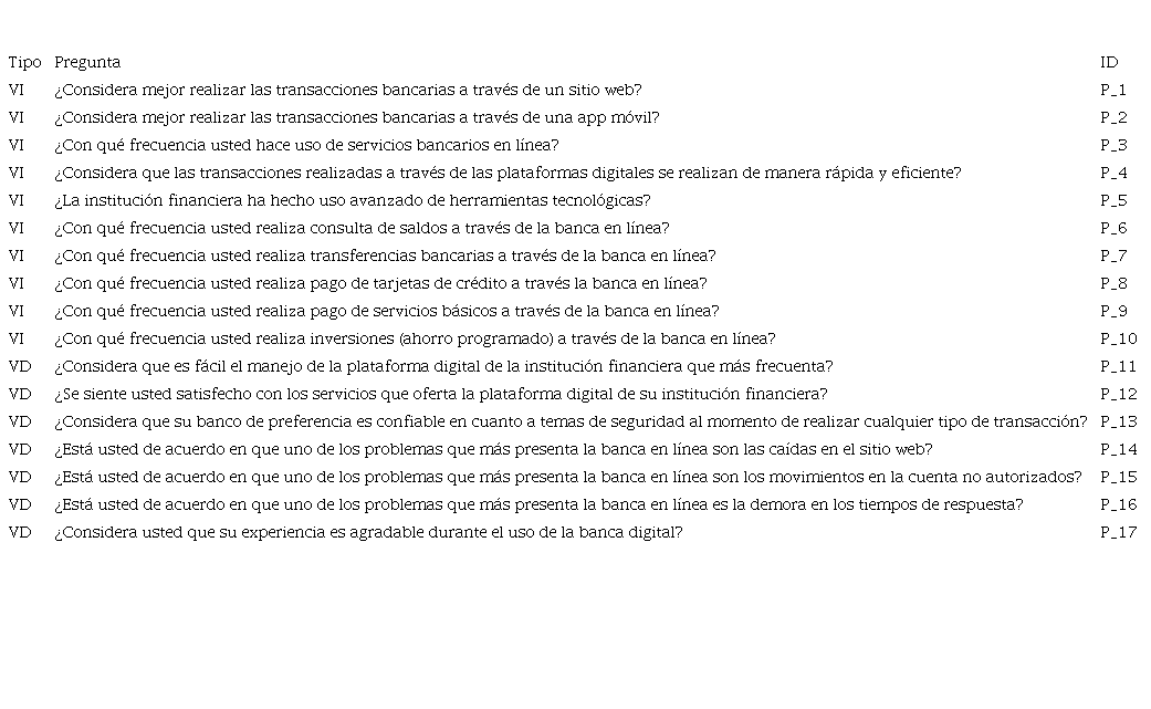 La encuesta estuvo diseñada en función de varios constructos, incluyendo así 17 ítems, aparte de 2 preguntas de carácter demográfico necesarias para la segmentación de los usuarios. Como parte de la variable “aplicación de la transformación digital” se consideraron 3 dimensiones: proyección, capacidad de respuesta e innovación, de las cuales se obtuvo un indicador para cada una, de la siguiente manera: plataformas alineadas a los avances tecnológicos, uso cotidiano de apps móviles y herramientas de gestión rápida en las plataformas Para la variable ”nivel de aceptación de los usuarios del sector bancario de la ciudad de Guayaquil”, se tomaron en cuenta también 3 dimensiones: aceptación de los usuarios, seguridad y fiabilidad, las mismas que se conformaron con los siguientes indicadores: nivel alto de satisfacción, nivel de seguridad dentro de las apps ofertadas y correcto funcionamiento durante su uso. De esta forma se obtuvo 10 preguntas de la variable independiente y 7 preguntas de la variable dependiente.