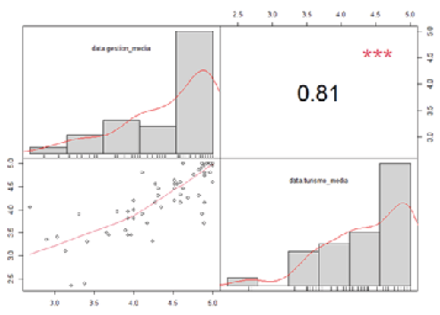 Además, los histogramas y curvas de densidad presentados en la figura, evidencian que las variables no siguen una distribución normal, lo que justifica el uso del coeficiente de correlación de Spearman (0.85) como una medida más adecuada para evaluar esta relación. No obstante, el coeficiente de Pearson (0.81) también muestra una asociación fuerte y significativa, lo cual valida la existencia de un vínculo positivo entre ambas dimensiones.