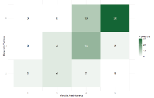 La celda con mayor frecuencia corresponde a la categoría “completamente” para ambas variables, con 30 casos, lo que indica una percepción muy positiva de la gestión administrativa y el desarrollo turístico. Sin embargo, hay celdas con frecuencias bajas, como la combinación gestión administrativa = 3 y desarrollo turístico = 5, con 2 casos, y gestión administrativa = 4 y desarrollo turístico = 2, con 0 casos; esto sugiere que hay pocas o ninguna percepción moderada de gestión administrativa asociada con extremos en el desarrollo turístico (ver figura 3).