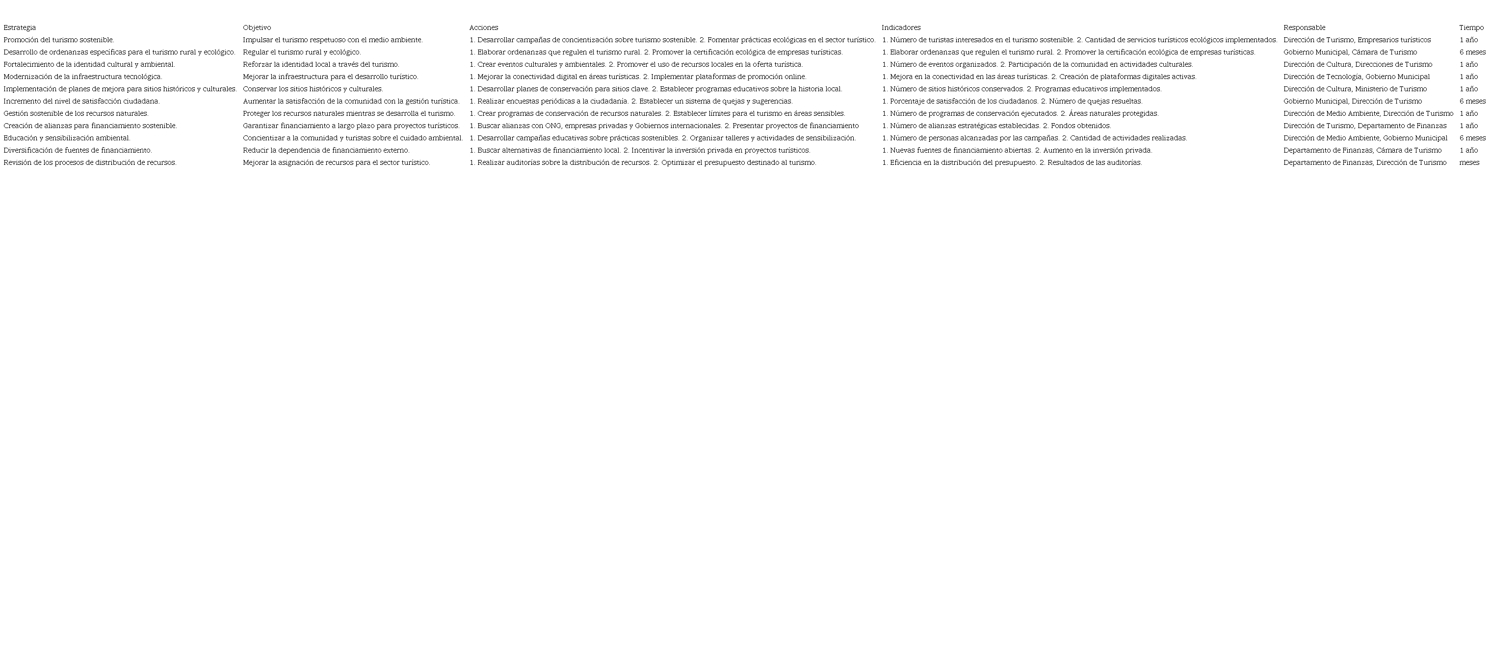Otra estrategia clave es el “desarrollo de ordenanzas específicas para el turismo rural y ecológico”, con el objetivo de regular estas actividades a través de la elaboración de ordenanzas y la promoción de certificaciones ecológicas, siendo el Gobierno Municipal y la Cámara de Turismo los encargados de implementar estas acciones en un plazo de seis meses.