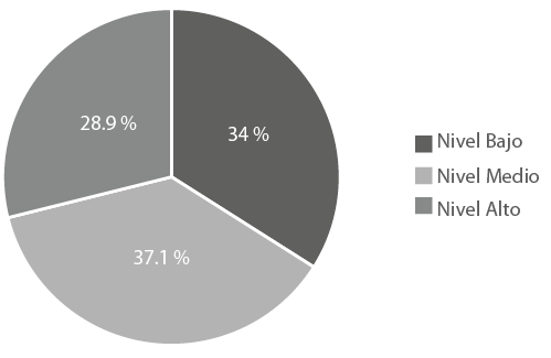 Los datos de la figura 1 en relación con el liderazgo transformacional, muestran que la mayoría de los participantes se agrupan en el nivel medio (37.1 %), seguido por el nivel bajo (34%) y finalmente el nivel alto (28.9 %).