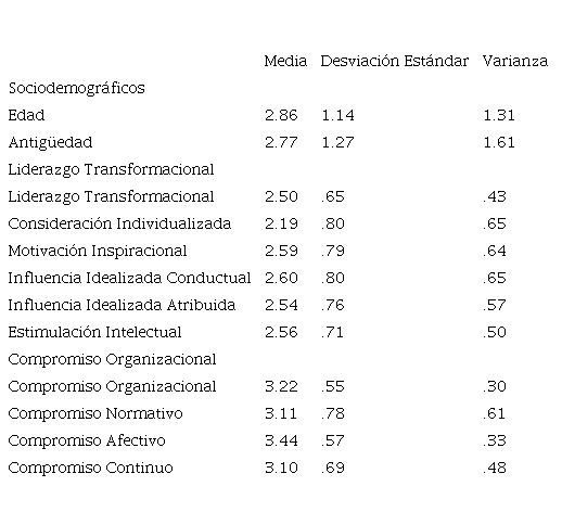 En cuanto al liderazgo transformacional, se destaca que las dimensiones de influencia idealizada conductual y la motivación inspiracional presentaron medias más altas. Por otro lado, la consideración individualizada registró una media más baja. Respecto al compromiso organizacional, el afectivo obtuvo la puntuación más alta entre las dimensiones evaluadas.