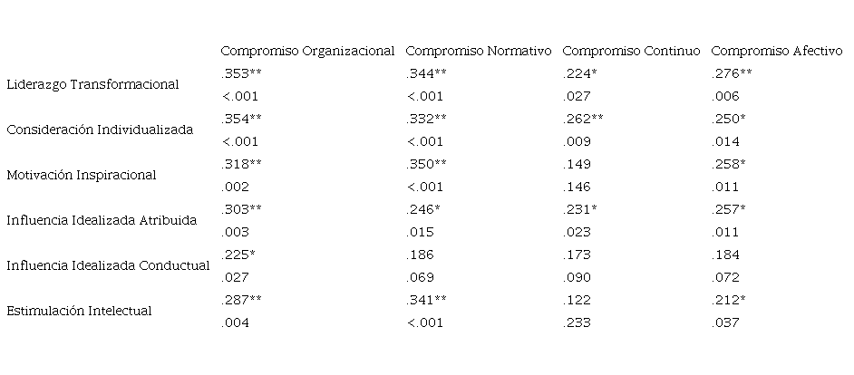 Correlaciones de liderazgo transformacional y compromiso organizacional