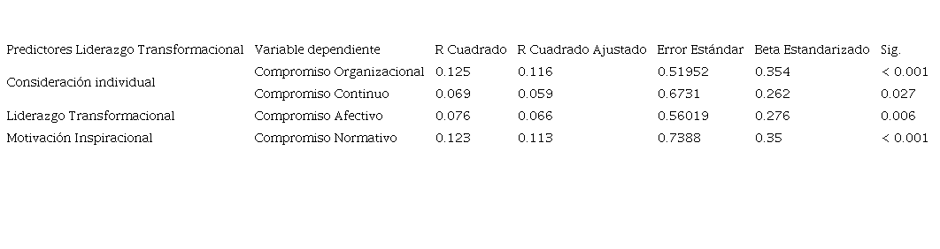 La tabla 6 presenta los resultados del efecto que tiene el liderazgo transformacional con el compromiso organizacional. Se destaca que el liderazgo transformacional tiene un efecto significativo y positivo con el compromiso organizacional total, explicando un 12.5 % de su varianza (R² = .125). En particular, la dimensión de consideración individual tiene un efecto destacado, con una beta estandarizada de .354 (p < .001). Para el compromiso afectivo, el liderazgo transformacional también demuestra un efecto positivo y significativo, explicando el 7.6 % de la varianza (R² = .076). Y la motivación inspiracional, que muestra un mayor efecto con el compromiso normativo, explicando el 12.3 % de la varianza en esta dimensión (R² = .123).