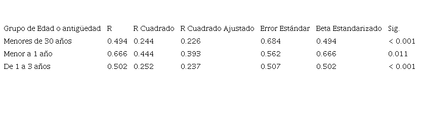 En la tabla 7 se muestra el efecto que tiene el liderazgo transformacional en el compromiso normativo según la edad. Cuando se analiza el compromiso normativo en jóvenes menores de 30 años, los colaboradores presentan un impacto más fuerte del liderazgo transformacional (R² = .244, beta = .494, p < .001).