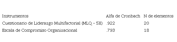 Una vez obtenida la información de la muestra, conformada por 97 participantes de 6 pequeñas empresas familiares de Colima y Villa de Álvarez dedicas al sector terciario, se realizaron pruebas de confiabilidad de los instrumentos, tal como lo muestra la tabla 1. Los resultados indicaron valores de 0.92 para liderazgo transformacional y 0.79 para compromiso organizacional.