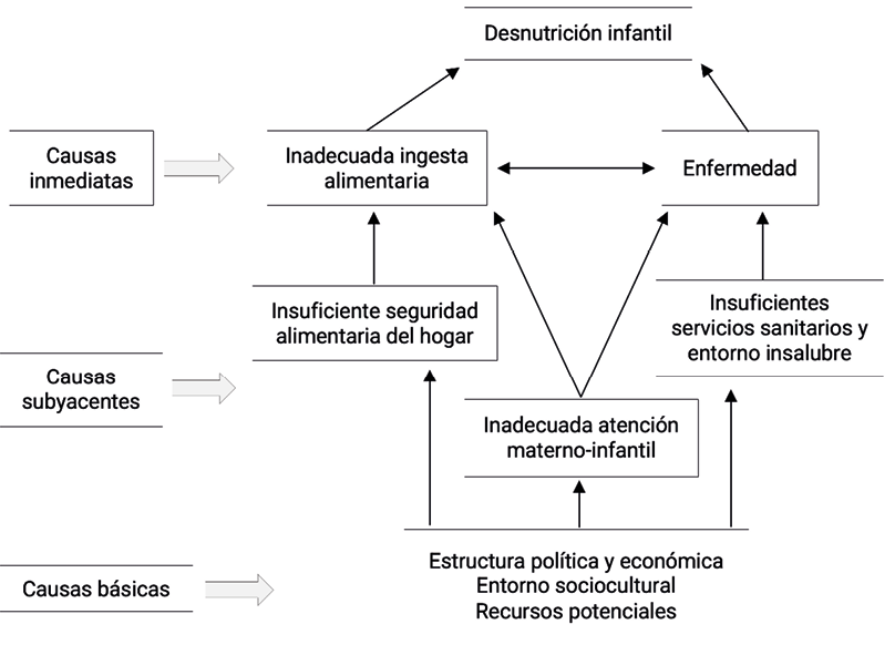 Smith y Haddad (2000) agrupan las causas de la desnutrición infantil en inmediatas, subyacentes y básicas. Las causas inmediatas se manifiestan a nivel del niño e incluyen las enfermedades, sobre todo infecciosas, que limitan la demanda de nutrientes y su absorción, y una inadecuada alimentación en calidad y proporción, aumentando el riesgo de morbilidad (Chanie et al., 2021).
